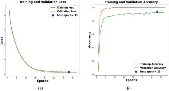 Using Keras [54] in Python [56], the suggested DL model and XAI algorithms were implemented in Google Colab [57] with an NVIDIA K80 graphics processing unit and 12 GB of RAM. Python (version 3.7) and Keras (version 2.5.0), which collaborate with the TensorFlow (version 2.5.0) framework, was provided by Google Colab as a runtime platform. During the training and validation of the proposed model, two callbacks were implemented. The first callback was used to monitor the validation loss and learning rate reduction with a factor of 0.5. The second callback was used for early stopping by recovering the best points throughout the course of four epochs. Furthermore, to prevent the model from over-fitting, both callbacks were imposed within 50 epochs.