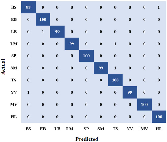 Confusion Matrix. ‘BS’, ‘EB’, ‘LB’, ‘LM’, ‘SP’, ‘SM’, ‘TS’, ‘YV’, ‘MV’, and ‘HL’ stand for bacterial spot, early blight, late blight, leaf mold, Septoria leaf spot, spider mite, target spot, yellow curl virus, mosaic virus, and healthy leaves, respectively.