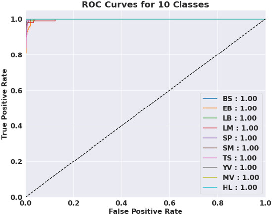 We evaluated the AUC ROC scores for each class to assess the efficiency of the proposed model (Figure 5). The average AUC ROC score across all classes was 1.0—demonstrating the model’s accuracy in correctly classifying instances. The CNN performed well for all courses as per the AUC ROC values for individual classes. These outcomes show how successfully the model handled the multi-class categorization issue.