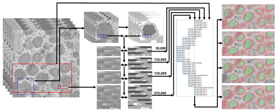 - A total of 135,000 pairs from manually delineated GT from a single cell, evaluated with multiple cells in the GT. The pairs of patches of labels and data were extended to cover every other slice of the whole region of interest (1:2:300). The size was again with 50% overlap; therefore, in this case, there were 150 slices and 900 patches per slice, which provided 135,000 pairs of patches for data and labels.