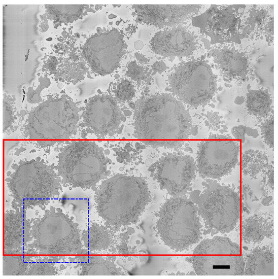 Details regarding the preparation of the HeLa cells have been previously described [75]. For completeness, these are briefly described here. Cells were embedded in Durcupan and observed with an SBF scanning electron microscope following the National Center for Microscopy and Imaging Research (NCMIR) protocol [77]. The images were acquired with a SBF SEM 3View2XP microscope (Gatan, Pleasanton, CA, USA) attached to a Sigma VP SEM (Zeiss, Cambridge, UK). Voxel dimensions were 10 × 10 × 50 nm with intensity values in the range [0–255]. Five hundred and seventeen images of pixels were acquired. A ROI was cropped by estimating manually the centroid of one cell at the centre of a box of voxels. Figure 2 illustrates a representative slice of one of the images with the ROI indicated by a dashed blue square and a solid red line a larger region to illustrate the qualitative evaluation. Figure 3 illustrates several slices of the ROI. All the EM dataset are publicly available through EMPIAR [78] at the following URL: http://dx.doi.org/10.6019/EMPIAR-10094 (accessed on 23 February 2023).