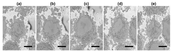 (a–e): Five representative slices of the region of interest (ROI) with the central slice (c) corresponding to the blue box in Figure 2. It should be noticed how the nucleus decreases in size towards top (d,e) and bottom (a,b) of the cell. Also, the nuclei of the cells that surround the central cell are particularly visible towards the bottom of the cell (a) at the left side and top of the cell (e) at the right and bottom of the image. Scale bar at the bottom right indicates 5 m.