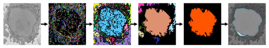 The semantic segmentations obtained with the different configurations of the U-Net were compared against a traditional image processing algorithm. Details of the algorithm have been described previously [72], but briefly, the algorithm is based on a pipeline formed of traditional image processing steps that are applied to a ROI that has been cropped from the whole dataset. The first step is low pass filtering to reduce the noise intrinsic to the acquisition of the electron microscope. Next, the areas of the image where the intensity changed abruptly were detected with the canny edge detection algorithm [79]. The nuclear envelope is not the only region of abrupt changes and thus, a large number of edges were detected. However, the edges were not used directly; rather, these were used to generate a series of superpixels which corresponded to all the areas of the image where edges did not exist. Again, a large number of superpixels were generated. Next, a series of morphological operations were applied. Specifically, small regions and those in contact with the edge of the image were discarded. Further, the central region of the image was selected, and then closing operations were used to smooth the final central region. This process was repeated on a slice-by-slice basis, starting from the central slice and propagating the results up and down the 3D stack. This process provided the combination of adjacent slices to select disjoint regions that belong to the nucleus. A simplified pipeline is illustrated graphically in Figure 4. This algorithm obtained accurate semantic segmentations, which outperformed other deep learning approaches [73]. However, in the case of U-Net, it was noticed that the inferior accuracy and Jaccard index were due to the discrepancy between the segmentation, which detected several nuclei, and the ground truth, which considered only the central nucleus. The Matlab code is available through GitHub: (https://github.com/reyesaldasoro/HeLa-Cell-Segmentation (accessed 23 February 2023)).