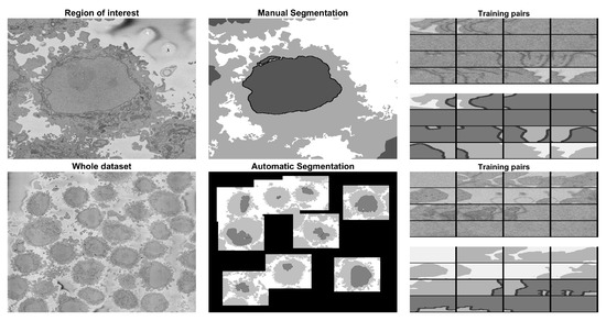 Machine learning and deep learning techniques have grown significantly in recent years [51] and a large number of architectures have been proposed with excellent results [52,53]. Whilst deep learning removes the need to hand-craft algorithms, one of the disadvantages is the scarcity of large datasets of training data. The training data of biomedical datasets are generally generated by manual delineation by a single expert, a group of experts or through citizen-science approaches [54]. Automatic labeling for the generation of training data is an attractive alternative to the time-consuming manual interventions. In areas different from biology, the use of synthetic datasets is a useful approach to generate training data [55,56]. Similarly, in some cases, the labels of well-defined objects are simplified, i.e., in the context of navigation, moving objects, such as cars or pedestrians, are labeled as moving, and all other objects are labeled as stationary [57]. In the context of synthetic aperture radar, it is possible to fuse together the image data themselves with a separate source of information, i.e., OpenStreetMap [58] or extra images from the Earth observation mission Sentinel-2 [59], to generate labels. In cell biology, and especially as observed with electron microscopy, none of these approaches are feasible due to the inherent variability of cells and other objects, which are less characteristic than a car or a pedestrian and the lack of alternative sources of information at the required resolution.