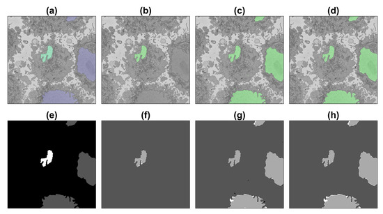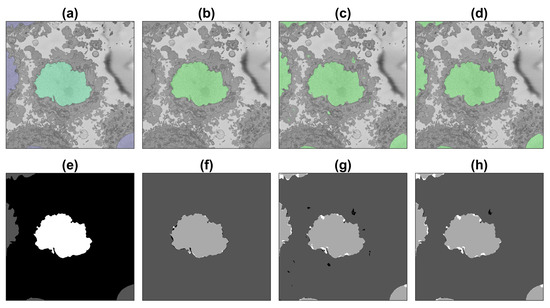 Illustration of the semantic segmentation of one slice (71/300) of the region of interest (ROI) with the image processing (IP) algorithm and U-Net trained with 135,000 patches. For a description of (a–h), see Figure 8.