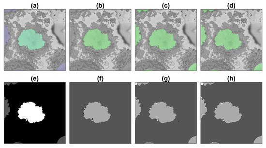 Illustration of the semantic segmentation of one slice (71/300) of the ROI with the image processing algorithm and U-Net (36,000 patches). Top row (a–d) show slice with results overlaid, bottom row (e–h) shows ground truth (GT) and results as classes. (a,e) GT, central nucleus in green/white whilst other nuclei in purple/grey and background in greyscale/black. (b,f) IP segmentation. (c,g) U-Net segmentation. (d,h) U-Net segmentation after post-processing. In (f–h) true positives = light grey, true negatives = darker grey, false positives = black, false negatives = white.