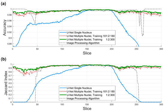 Accuracy and Jaccard index results are shown in Figure 11 and in Table 1. Several points are worth mentioning. When the U-Net was trained and measured with GT with a single nucleus (solid blue line in Figure 11), the results were good between slices 150 and 200 of the ROI, as these slices contained only one nucleus. Toward the top and bottom of the ROI, the accuracy and JI dropped as other nuclei appeared in the images, and these were segmented, but were not part of the GT, and consequently, the numbers dropped. The results of the image processing algorithm (thin dashed black line in Figure 11) were very good, especially toward the central region of the cell, where the nucleus is largest. These results considered only the central cell. Toward the top and bottom of the cell, where the nucleus is smaller and the shape less regular, the accuracy remained high due to the large number of TN, but the JI dropped in a similar way to the U-Net with a single nucleus and was zero in the extremes due to the absence of TP.