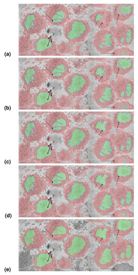 As a further segmentation test, the U-Nets trained on multiple nuclei were used to segment the slices. The results were evaluated visually due to the lack of ground truth. Figure 12 shows the results of the U-Nets and the image processing algorithm. Figure 12a shows the segmentation obtained with the U-Net trained with 36,000 pairs, Figure 12b shows the segmentation with 135,000 pairs from the single cell from the ROI, Figure 12c shows the segmentation with 135,000 pairs automatically generated with the image processing algorithm, Figure 12d shows the segmentation with 270,000 pairs, and Figure 12e shows the segmentation with the image processing algorithm.