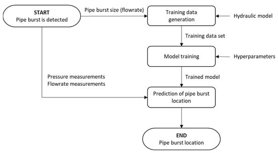 Flowchart of proposed methodology for pipe burst location using neural networks.