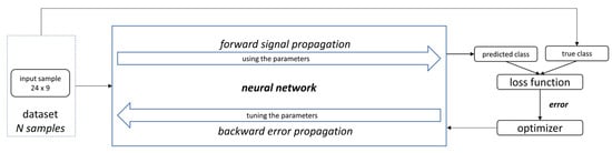 Training a neural network consists of determining the weights of each neuron so that when presented with a specific input, it produces the expected output. The training process happens in two stages: forward signal propagation and reverse error propagation. A backpropagation algorithm (BP) calculates the gradient of a loss function with respect to the weights of the network. BP uses gradient descent to search the space of possible hypotheses in an iterative way, reducing the error when fitting the network to the training examples. Gradient descent converges to a local minimum error in training regarding the network weights. The training error must be a differentiable function of the hypothesis parameters. BP can create meaningful representations of the input data. The internal layers of a multilayer neural network learn intermediate features’ representation, which is useful for learning the target function and is not explicit in the network inputs [26]. The training process is visualized in Figure 2.