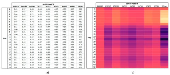 Example of a data sample, showing the normalized hourly measurements during a 24 h period (one day) for each WDN sensor: (a) numeric values in tabular form; and (b) visual representation using a color scale.