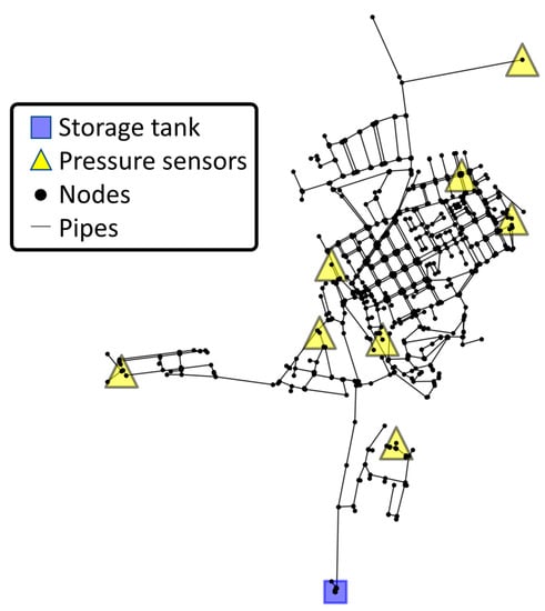 The case study uses an existing WDN in the Lisbon metropolitan area, serving a population of 14,000 inhabitants and supplying approximately 700,000 m3/year of drinking water. The network supplies a 4 km2 area containing residential, commercial, and services buildings such as supermarkets, schools, a central hospital, a large sports complex, shops, and industrial plants, it being very heterogeneous in terms of construction typology and functionality. The WDN has about 2200 service connections and an approximate length of 36 km. The pipe material is 63% asbestos cement, 34% polyvinyl chloride (PVC), and 3% high-density polyethylene (HDPE), with diameters in the range of 32 to 400 mm. The EPANET hydraulic model for this network includes 967 pipes and 1262 nodes, with one storage tank, simulated as a constant level reservoir, and an associated pumping station operating at a constant pressure throughout the day. The hydraulic model includes 24 h consumption patterns, allowing extended period simulations. The WDN can be visualized in Figure 5, showing the storage tank which contains the flow rate meter (using a blue square marker) and the location of the eight pressure sensors (using a yellow triangle marker). The process used for determining the optimal number and location of pressure sensors for WDN monitoring is presented in [4,32].
