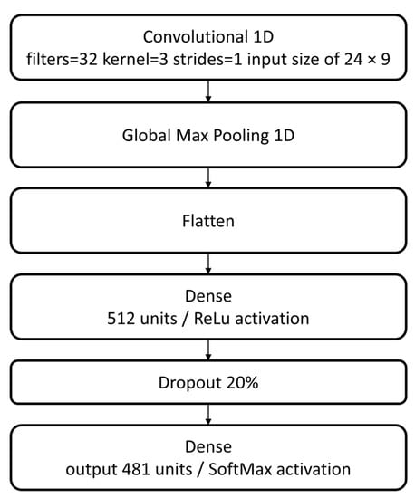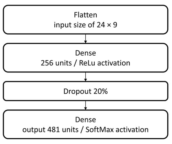 A simple neural network structure is implemented as a baseline for starting the tests procedure. This structure consists of a group of sequential layers: flatten input with a shape of 24 rows by 9 columns, dense with 256 units and rectified linear unit (ReLu) activation, a 20% dropout, and dense output with 481 units and SoftMax activation, as displayed in Figure 6.