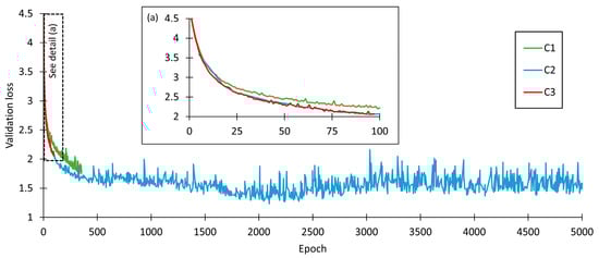 The full training (5000 epochs) allowed the detection of the inflection of the validation loss and accuracy curves, showing that the best values were achieved just before epoch 2500, as can be seen in Figure 7. ES criteria with a patience setting of 20 epochs were too low to achieve the optimal values. Taking in account the minor difference between the optimal value and the final value at 5000 epochs, and that, in this specific case, the fine tuning of the other parameters demonstrates that the early stopping parameter stops being useful, a decision was made to stick to training until 5000 epochs were reached. This decision will also allow full assessment of the validation loss curve progression.