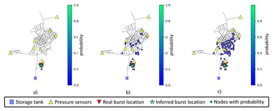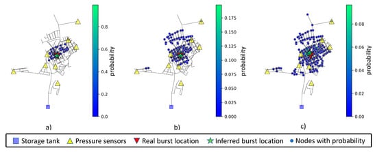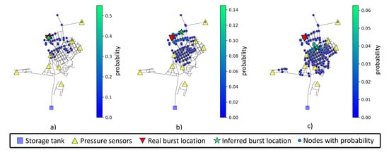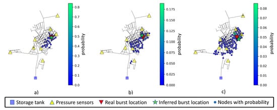 With 1% noise added, the area of interest (composed by nodes that have a probability greater than zero) starts to become more dispersed and, depending on the proximity of the burst node to a sensor, the model can still be accurate. Even if the model is inaccurate, the set of relevant nodes (with highest probability) highlight the possible area in which the burst occurs. The distance range for prediction of the analyzed nodes is between 0 and 200 m.