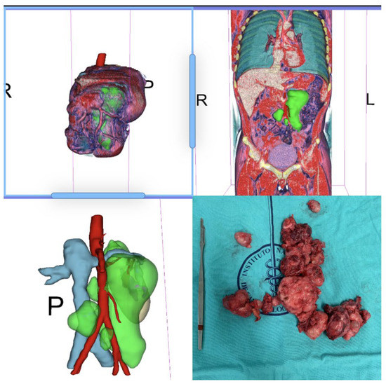 The 3D Slicer program has been used in the context of retroperitoneal tumors to determine radiomic variables that can predict their histology. Baessler et al. identified five physical characteristics of tomography, which in an initial model predicted malignancy vs. fibrosis or necrosis with a sensitivity greater than 95% in the pre-test phase, which in its prospective application was adjusted to approximately 85% [13]. The presence of fibrosis or a desmoplastic reaction in the post-chemotherapy residual masses could complicate the surgical resection. The reaction induced by chemotherapy in residual masses often results in a more difficult resection, with firm adherence to the great vessels and adjacent organs. During the surgery, careful handling is required to avoid injury of the ureter, bowel, and vessels.