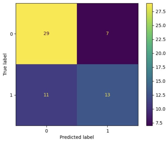 Using the Pyradiomics package, a logistic regression was performed (with the scikit-learn python library) using the entire dataset (n = 60). The algorithm identified 29 true negative cases (VPN), 13 true positive cases (PPV), 11 false negative cases, and seven false positives (Figure 5), with Accuracy: 0.7 and Precision: 0.65. Using a random sample of n = 30, the best result had an Accuracy of 0.73 and Precision of 0.83, with a p-value of 0.025 for the Fisher’s exact test.