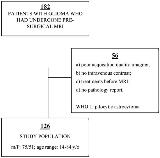 Our institution’s database was retrospectively examined, and 182 patients who had undergone MRI for pre-surgical glioma evaluation between 2018 and 2021 were identified. Additionally, pathology reports were collected to obtain the glioma grades. Several patients were excluded from the study according to the following criteria: (a) poor acquisition quality imaging; (b) no intravenous contrast; (c) treatments before MR examination, including steroid drugs that may affect edema and contrast enhancement; (d) no pathology reports. Pilocytic astrocytoma (World Health Organization grade 1) was excluded from our study due to its unique imaging characteristics. Finally, 126 patients diagnosed with gliomas were enrolled (Figure 1). The study group comprised 75 males and 51 females, ranging in age from 14 to 84 years (additional data is shown in Table 1).