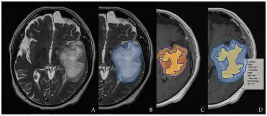 An example of tumor segmentation for necrosis depiction. The segmentation of the T2 hyperintensity region designated as tumor invasion is shown in (A,B) on an axial plane (blue); the axial post-contrast T1WI shows segmentation of the necrotic area (yellow) compared to the enhancing tumor (orange; in (C)) and lesion/tumor area (blue; in (D)); the necrosis percentage is also calculated in (D).