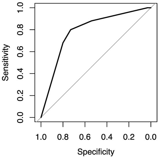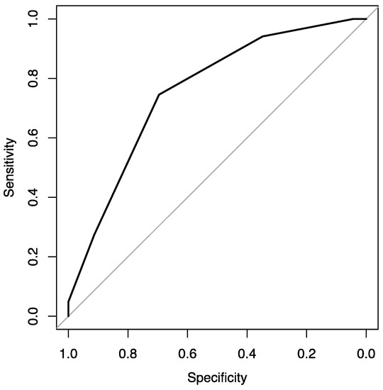 At the same time, variable F6 is statistically significant for the grade prediction (p value = 0.0032 < 0.05). The F6 variable has a statistically significant difference between F6 = 3 and F6 = 4 (p value = 0.032 < 0.05). In particular, F6 = 3 (or more) has a 92% probability (or more) of being at the high level, while the probability of the other levels (F6 < 3) is much lower (0% and 46%). This model has an accuracy of 0.736, a sensitivity of 0.745, a specificity of 0.696, and an AUC of 0.757 (Figure 3).