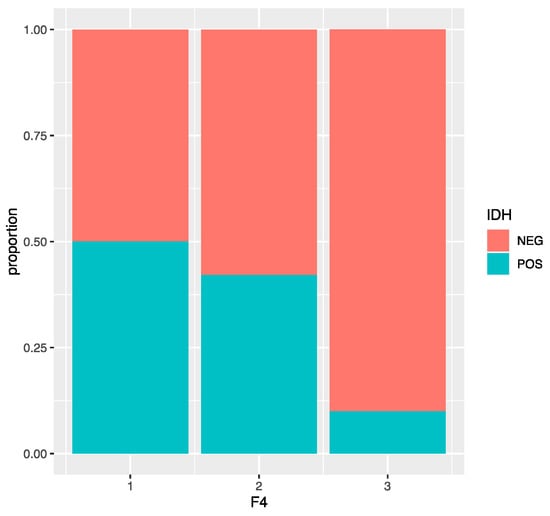 Most of the time, the highest levels of F5 (Figure 5) seem to correspond to a negative IDH, and this variable is statistically significant with a p value = 0.00034 < 0.05 and a cut-off level of F5 = 3. Additionally, F5 = 2 and F5 = 3 have a high probability of 50% and 57%, respectively, of having a positive IDH, while the probability of the other levels is much lower (around 15%). This model has an accuracy of 0.808, a sensitivity of 0.48, a specificity of 0.890, and an AUC of 0.73.