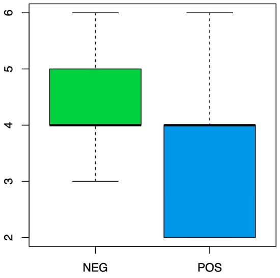 Additionally, the variable F5 is statistically significant for the grade prediction (p value = 0.00388 < 0.05) and shows a cut-off level of F5 = 5. This means that an F5 = 5 has a 91% probability of being at the high level (grades 3 and 4), while the probability of the other levels (F5 < 5) is much lower (56% and 57%). This model has an accuracy of 0.792, a sensitivity of 0.873, a specificity of 0.435, and an AUC of 0.677.