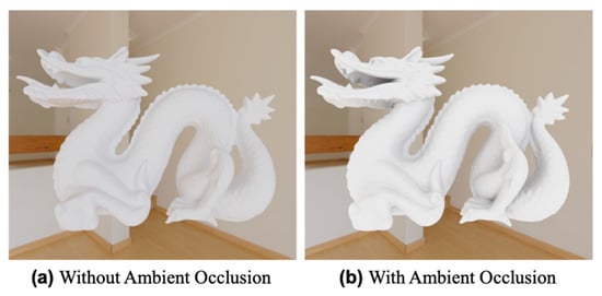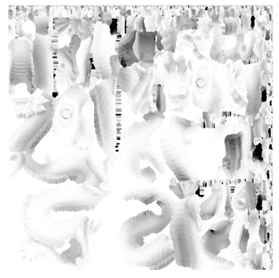 In this study, we use Blender [38], which is a free modeling and rendering software with the method of ambient occlusion built in [39]. The results of applying the method of ambient occlusion are shown in Figure 2. The geometry of a dragon is imported from the Stanford 3D Scanning Repository [40]. It is seen that shading is added according to the degree of occlusion. The ambient occlusion result in Figure 2b is exported as a texture image, resulting in the image shown in Figure 3 unfolded on a plane.