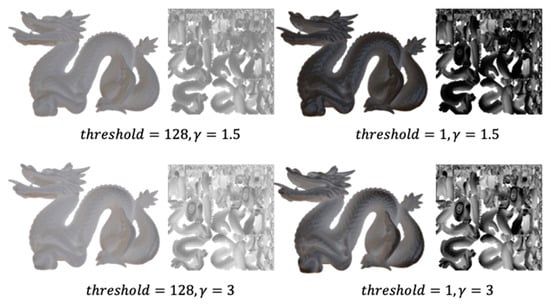 We finally explain the purpose of gamma correction. It has been shown that thin or detailed regions of a structure are important in translucency perception [32]. Therefore, it is necessary to have a large effect even in areas where the degree of occlusion is relatively small (i.e., thin and detailed areas). To achieve this, a gamma correction is applied to expand the effect of reducing shadows to areas with smaller occlusion. Figure 4 shows examples of textures created by varying the parameters and . A texture image is shown on the right side of each panel and a rendered image with the texture applied is shown on the left side. It is seen that the parameters can be adjusted to generate textures with different characteristics.