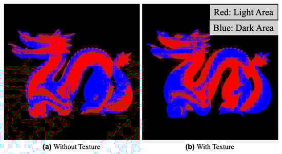 Overview of encoding shading patterns. The light and dark areas, which are divided by the median of luminance on the surface, are respectively shown in red and blue. (a) is an example of without texture and (b) is an example of with texture. It is seen that the pattern differs greatly depending on the presence or absence of texture.