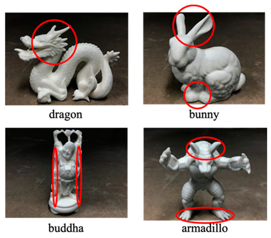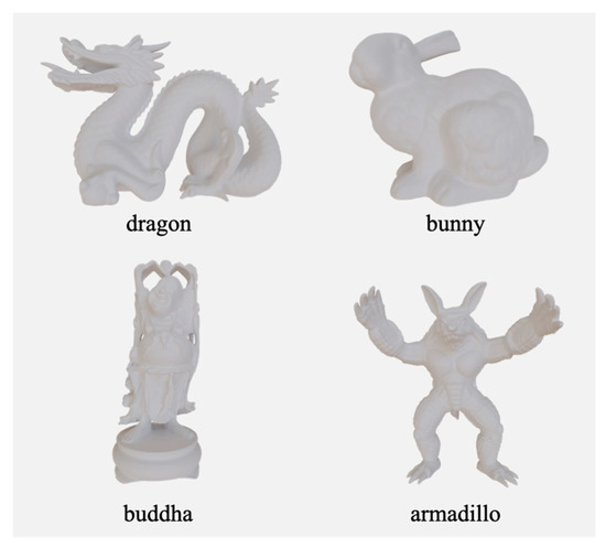 Geometries used in the experiment [40]: a dragon, bunny, Buddha, and armadillo.