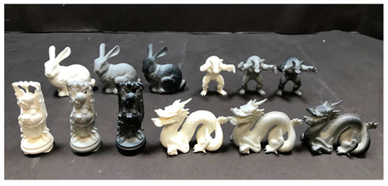 We used four geometries, namely, a dragon, bunny, Buddha, and armadillo as shown in Figure 6, taken from the Stanford 3D Scanning Repository [40]. For each geometry, we created a texture whose parameters were determined using the two indexes described in the previous section. In addition to these eight samples, non-textured samples were fabricated to validate the effect of the texture. The bulk was fabricated entirely with 100% white ink and was physically opaque. The 3D printer used in this experiment was a Mimaki Engineering 3DUJ-553 [22]. Figure 7 shows the fabricated samples. Close-up photos of each object are provided in Figure S2 in the Supplementary Materials.