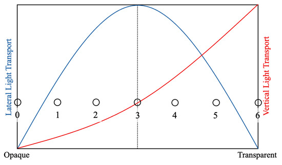 We first discuss issues in considering definitions and scales of translucency. In the field of translucency perception, the term translucency is regarded as having no clear definition [1]. Commonly used psychophysical scaling methods, such as the adoption of magnitude estimation and rank order, are not appropriate in this case because of this ambiguity in the definition of translucency. Instead, many studies adopt matching tasks involving computer graphics [29,32]. Although it would have been preferable to conduct a matching task in the present experiment, it is difficult to adjust parameters in real time in an experimental setting using real objects, making it impossible to perform the task. Therefore, in this experiment, we established our own definition and scale of translucency and held a session to explain them to participants before the evaluation task. We referred to the relationship between scattering and transparency described in the literature [10] and defined translucency as an index determined by the relationship between horizontal and vertical light transport. When an object changes from opaque to transparent, it is known that the horizontal and vertical light transport changes as shown in Figure 8. The horizontal light transport (i.e., spread of light due to sub-surface scattering) does not change monotonically, and it is thus combined with the vertical (transmission) to uniquely define the degree of translucency as shown in Figure 8. To enable subjects to recognize differences in appearance due to changes in the degree of scattering, samples with varying scatterer densities were created using a 3D printer and presented to the subjects. Figure 9 shows samples with scatterer density varying from opaque (light does not penetrate into the interior at all) to transparent (light penetrates into the interior but is not scattered at all), and we assign values on our scale. Considering the balance between task difficulty and granularity, we designed a seven-level evaluation task as indicated by the circles in the figure.