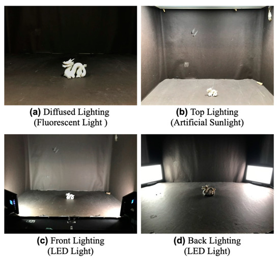 The following is a description of the lighting environment. In the present experiment, four lighting environments were prepared as shown in Figure 10. We prepared multiple environments because it is known that the lighting direction affects the perception of translucency [1]. The first environment was of fluorescent light. The method of ambient occlusion is expected to be highly effective under such diffused illumination because it takes ambient light into account. The second environment was of artificial sunlight. Such lighting is commonly used in psychophysical experiments, and the booth used in the present experiment had top lighting. The third and fourth environments were of front and back lighting with illumination from light-emitting diodes. On the basis that back lighting enhances translucent perceptual cues more than front lighting in studies of translucency perception [29,32], we used front- and back-lighting environments.