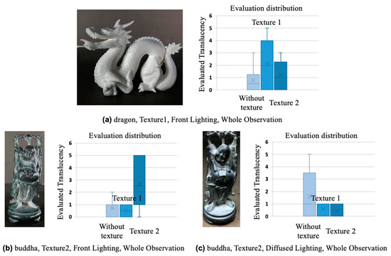 We discuss the conditions for which there were particularly high and low evaluations of translucency. Figure 12a shows an image of the dragon object with texture 1 taken under the condition of front lighting. Note that this image was captured by a camera and therefore differs from the image perceived by human vision, and the graph to the right of each example shows the distribution of evaluations. Under this lighting condition, the evaluation value is particularly high in the whole-object observation. We consider that the effect of contrast reduction by texture 1 was appreciable under this lighting condition. Some of the participants who perceived high translucency also perceived a wet appearance. The possibility of a correlation between wetness and translucency is suggested and will be the subject of future research. Figure 12b shows an image of the Buddha object with texture 2 taken under the condition of front lighting. Under this lighting condition, the evaluation value is particularly high in the whole-object observation. This is because the extreme brightening by texture 2 is concentrated in areas with detailed structure. There are thus many cues for translucency perception under this condition. Finally, Figure 12c shows an image of the Buddha object with texture 2 taken under the condition of diffused lighting. Under this lighting condition, the texture reduces the perceptual translucency in the whole-object observation. Most of the participants commented that the object appeared to have black paint on it, and it is thus assumed that this lighting condition caused the texture to be perceived as paint rather than as shadows.