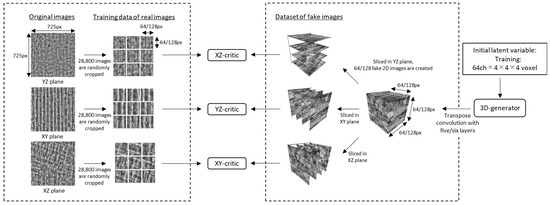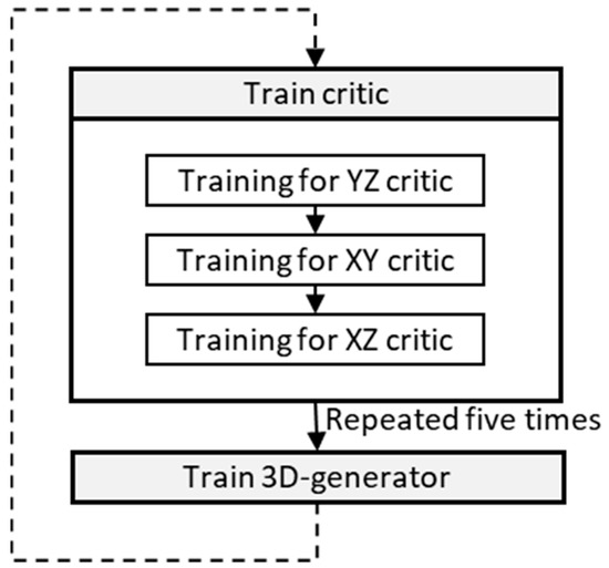 Figure 2 shows the hyperparameter update process for the 3D generator and critic. In one epoch, the critic is trained five times using cropped 2D and fake sliced images, while the 3D generator is trained once. After repeated training, 64 sets of latent variables in the format of 18 × 18 × 18 and 10 × 10 × 10 voxel are input to the 3D generators of model_64 and model_128, respectively, to obtain a larger 3D synthetic image with a 512 × 512 × 512 voxel multiplied by 1 channel. Both models use thirty-two subdivided datasets (batch size) for generator training, performed only once. Meanwhile, eight subdivided datasets are used for critic training, which is repeated five times in one iteration. The optimizer used is Adam, as in the original SliceGAN model [4].