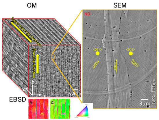 Pseudo-3D 3D optical microscope (OM) image synthesized by manually combining the three perpendicular cross-sectional images. A magnified scanning electron microscope image and inverse pole figure map are also shown.