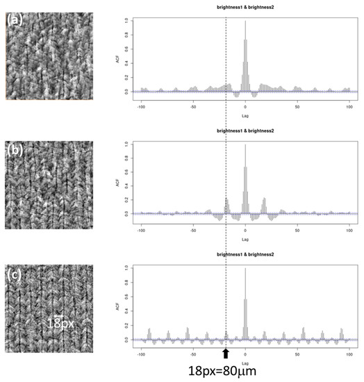 To assess the quality of the synthetic 3D image generated in this study, a quantitative evaluation was performed by comparing it to the original image. The microstructure under investigation was the additive-manufactured TYPE 316L steel, which exhibits a characteristic pattern known as the “crystallographic lamellar microstructure (CLM)” [9]. The periodicity of this CLM is a unique fingerprint of the microstructure because it corresponds to the laser scanning region, which has a constant interval of 80 μm. To evaluate the periodicity of the CLM, the auto-correlation function (ACF) [10] was used, which has an advantage over the fast Fourier transform (FFT) [11] in evaluating imperfect periodicity.