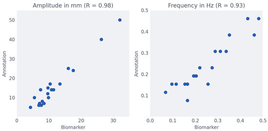 Comparison of biomarkers to manual annotation. Comparison of the biomarkers as calculated by the algorithm (y-axis) to manual annotation (x-axis). (Left) The movement amplitude was measured in mm with a Pearson’s Correlation Coefficient (R) of 0.98, (Right) the movement frequency was measured in Hz with a Pearson’s Correlation Coefficient (R) of 0.93.