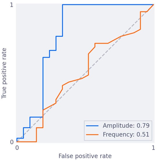 ROC curves on train set for classification of insufficient vs. sufficient slices. ROC curves on the training set for classification of insufficient (0, 1) vs. sufficient (2, 3, 4) slices, using only the Amplitude biomarker (blue) or only the Frequency biomarker (orange). The Amplitude biomarker has an AUC of 0.79, and the Frequency biomarker has an AUC of 0.51.