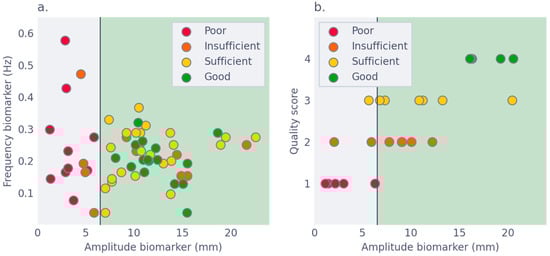Quality criterion differentiates between sufficient and insufficient quality. (a) The Frequency and Amplitude biomarker for each case in the 30-slice test set, where the colors of the circles, red to green, correspond to the subjective quality score, Poor to Good. The vertical line visualizes the amplitude criterion. (b) The same plot as (a), but with the subjective quality score on the y-axis.