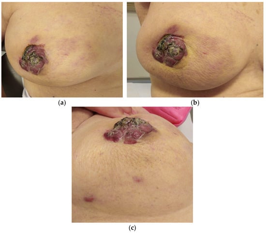About SBA, it has cutaneous and/or subcutaneous localization [,,,] so it often presents with cutaneous changes and lesions, either in the chest wall or residual breast parenchyma, rather than a palpable mass. Cutaneous lesions are predominantly represented by erythematous or violaceous plaques, nodules, ecchymosis [], skin discoloration, erythematous areas, bluish to reddish or black nodules, and edema [] (Figure 1). Ulceration may or may not be present [].
