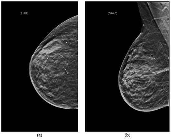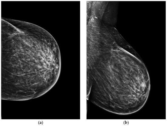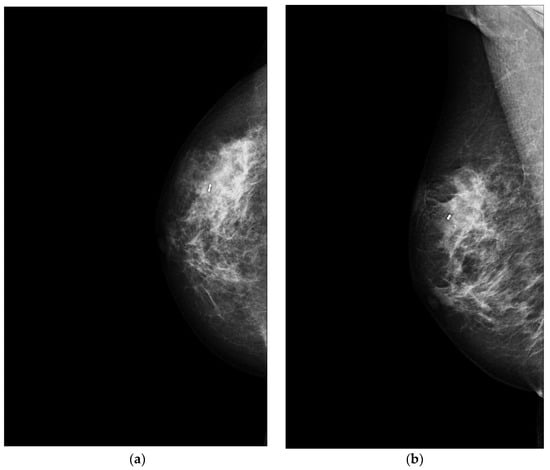 Focusing on PBAs, Wu et al. investigated their features on mammography, concluding that they are nonspecific []. Indeed, the authors describe PBAs as lobulated or oval masses, large diffuse asymmetries with irregular density, alterations of breast trabecular structure, thickened local vessels, irregular densities of subcutaneous fat, and skin thickening. Nevertheless, no enlarged axillary lymph nodes were reported. The authors did not find associated microcalcifications: this could be explained by the origin of PBA from parenchymal rather than ductal structures (where the calcium is deposited) and/or by its rapid growth []. Another retrospective study published by Wang et al. investigated PBAs on 36 patients and agreed on the nonspecificity of their mammographic characteristics: circumscribed noncalcified masses were described in most of the patients and no remarkable findings were found in 43.8% of patients []. However, patients diagnosed with PBA were more likely to present with a clinically and radiographically detectable parenchymal mass than those with SBA (p < 0.002) []. Additionally, BA might manifest as a focal asymmetry and this can be explained by its infiltrating nature [] (Figure 2).