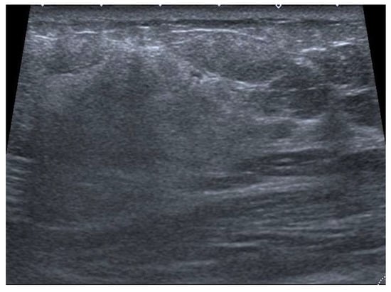 A study published by Yang et al. retrospectively reviewed the US features of 21 BAs: most of them appeared as solid masses with an oval shape and circumscribed margins, without posterior acoustic phenomena, and, in a minority of cases, with lobular shape and indistinct or microlobulated margins. In addition, almost half of mass lesions are hypoechogenic, while the others may show hyperechogenicity or mixed features: this could be explained by the vascular nature of the tumor with the presence of multiple interfaces of vascular channels [] (Figure 6, Figure 7 and Figure 8).