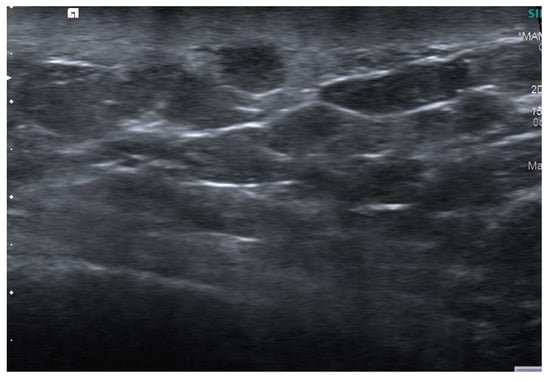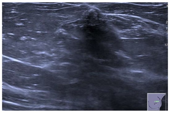 Focusing on the differential diagnosis with other hyperechoic breast lesions, it should be highlighted that the majority of them are benign. These include: lipoma, angiolipoma, haematoma, seroma, fat necrosis, silicone granuloma, sebaceous or epidermal inclusion cyst, abscess, pseudoangiomatous stromal hyperplasia (PASH), galactocele or lactating adenoma, ductal ectasia, and apocrine metaplasia []. On the other hand, even other malignant lesions can be hyperechoic: infiltrating ductal or invasive lobular carcinomas, but also some uncommon tumors, such as lymphoma or metastatic lesions [].