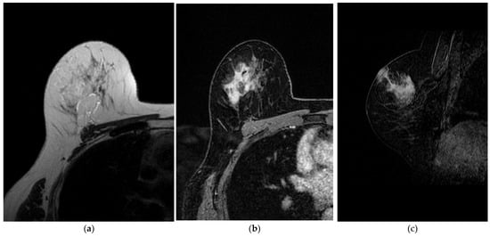 In a study conducted on thirteen women, BA showed both heterogeneous and slightly or significantly high homogeneous with hypointense necrotic or cystic components on T1-weighted images and inhomogeneous high signal on T2-weighted (w) images. About half of them presented as hemorrhagic lesions characterized by hyperintensity on both T1-w and T2-w images or with a hemosiderin ring (resulting from long-term hemorrhage). On post-contrast images, a vivid heterogeneous enhancement was demonstrated []. In particular, the kinetic enhancement is strictly linked to tumor grade: the kinetic curve shows a rapid enhancement with rapid washout in the highest grades, while a plateau or a persistent enhancement is seen in the lower ones [,,,,,,]. In addition, high-grade tumors may also present hemorrhage or vascular lakes, displayed as focal areas of hyperintensity on T1-w images [] (Figure 9).