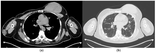 CT can be useful to find distant localizations of disease in case of metastatic spread. In particular, lung parenchyma is the most frequent localization, but metastasis were reported also in liver, skin, bone, central nervous system, spleen, lymph nodes, ovary, and heart [,,,,] (Figure 12).