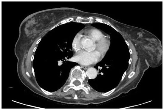 A 75-year-old patient with a history of lobular invasive carcinoma of the right breast treated with quadrantectomy and radiotherapy. Mediastinal window of a follow-up CT scan shows skin thickening of the right breast.