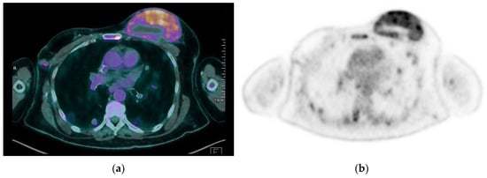 There is a lack of knowledge about the role of positron emission tomography-computed tomography (PET-CT) in breast angiosarcoma. The few case reports available in the current literature show that PBA and SBA are avid of F-18 fluoro-2-deoxy-D-glucose (FDG) in both primary and metastatic localizations [,,] (Figure 14).