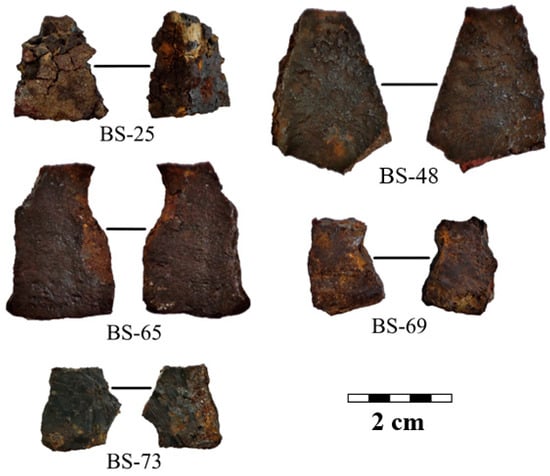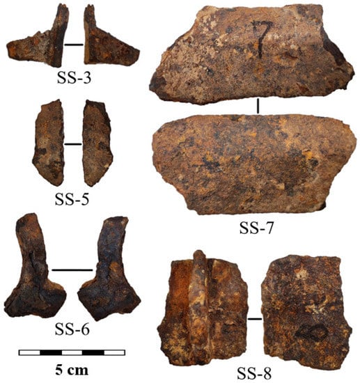 The metal samples under study are ten fragments from cast iron cauldrons, which date back to the 13–15th centuries AD. Photos of fragments N 25, 48, 65, 69, and 73 from the Bolgar settlement are presented in Figure 1. For extended labeling of the samples, we applied a mixed label with the official collection number of the sample and the coded location of the archaeological work: the Bolgar settlement (BS) and the Selitrennoye settlement (SS). Photos of fragments N 3, 5, 6, 7, and 8 from the Selitrennoye settlement are shown in Figure 2. These cast iron samples are larger than ones from the Bolgar settlement. The average length is in the range of 3–10 cm, and the thickness is up to 10 mm. The metal surface of all fragments is covered with corrosion.