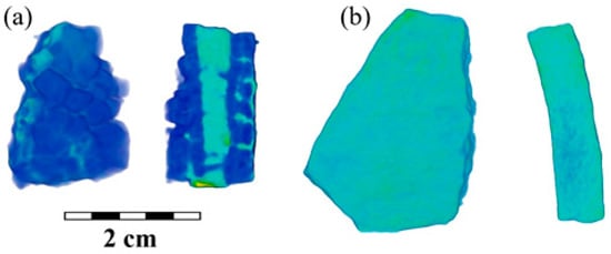 (a) The reconstructed 3D model and example of its longitudinal slice for the fragment BS-25. The cast iron regions are labeled in blue, and the possible welding track material is green–blue. (b) The reconstructed 3D model and example of its longitudinal slice for the fragment BS-48. A scale bar is presented.